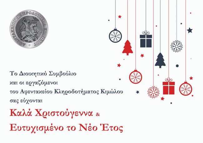 Τα γραφεία του Αφεντακείου Κληροδοτήματος Κιμώλου δεν θα λειτουργήσουν τις ακόλουθες ημερομηνίες: Δευτέρα 25/12/2023 – Τρίτη 26/12/2023 Δευτέρα 01/01/2024 – Τρίτη 02/01/2024   Τις ημέρες Παρασκευή 22/12/2023 και Παρασκευή 29/12/2023, τα γραφεία του Κληροδοτήματος θα λειτουργήσουν από τις 08:00 έως τις 14:00.   Το Διοικητικό Συμβούλιο και οι εργαζόμενοι του Αφεντακείου Κληροδοτήματος Κιμώλου, σας εύχονται…