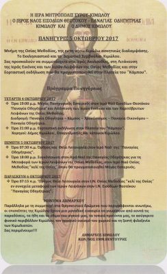 Το Εκκλησιαστικό και το Δημοτικό Συμβούλιο της Κιμώλου προσκαλούν τους μόνιμους κατοίκους και τους επισκέπτες του στις τριήμερες (04-06/10/2017) εκδηλώσεις προς τιμήν της Οσίας Μεθοδίας, η οποία γεννήθηκε, έζησε και αγίασε στο νησί από το 1861 έως το 1908.